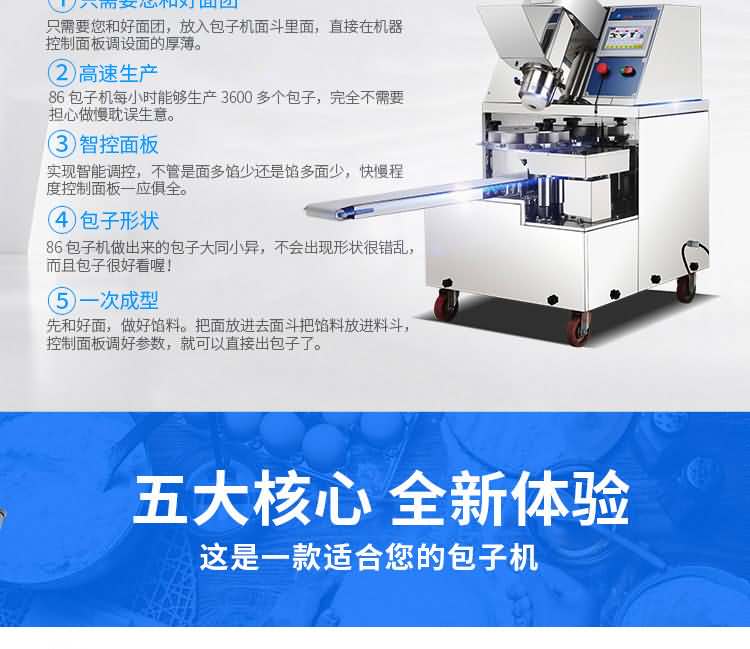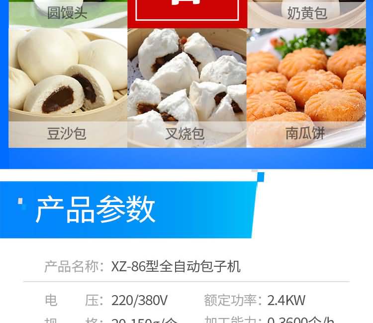 XZ-86型全自動包子機,可生產(chǎn)各種肉包、菜包、肉菜包、小籠包、湯包、水晶包、圓饅頭、奶黃包、豆沙包、叉燒包、南瓜餅、煎堆等十幾種包餡制品。適用于賓館、飯店、學校、機關企業(yè)食堂、饅頭或包子加工廠、早餐工程店及速凍食品廠等單位。可滿足不同客戶群體。免費提供工藝技術。免費上門培訓指導安裝。