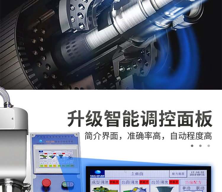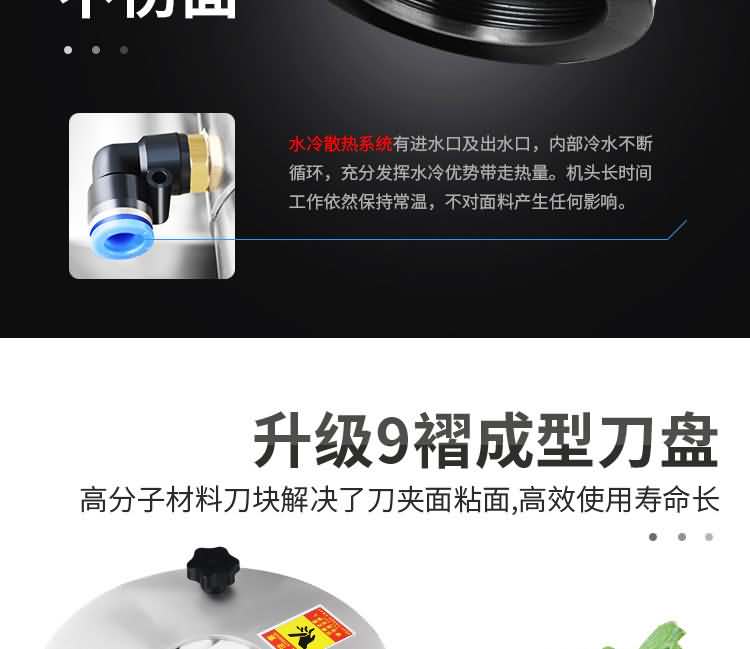 ◆出面系統(tǒng):采用單攪龍,大螺徑【北方機器由于加工手段受限一般攪龍很小需要轉(zhuǎn)速很快才能出料】半臥式出面方式??梢栽跀D相同分量面皮與小攪龍相比的情況下,大大降低攪龍轉(zhuǎn)速,讓面皮出料壓力小,達到揉面的效果,不傷面筋,口感佳!并配正副攪龍以保證出面均勻。