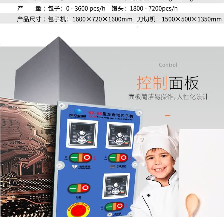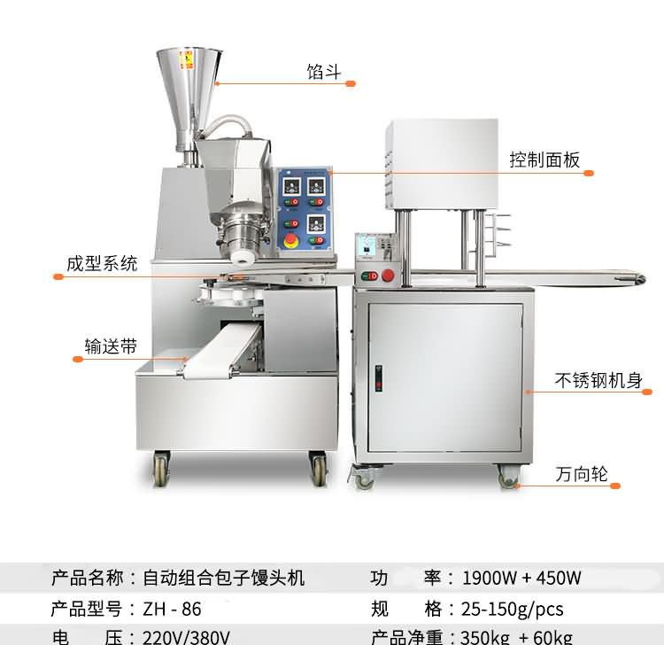 ZH-86型自動組合式包子饅頭機是一款產品性能穩定、自動化程度高,功能多且產品多樣化的設備。采用高品質微電腦變頻控制面板、電機電器,操作更方便、維護更簡單;不銹鋼制作、經久耐用、美觀衛生;可生產花包、光頭包、圓饅頭、南瓜餅、月餅、小籠包和各種肉餡、菜餡、純白糖餡、芝麻餡、豆腐餡等各種包餡食品。