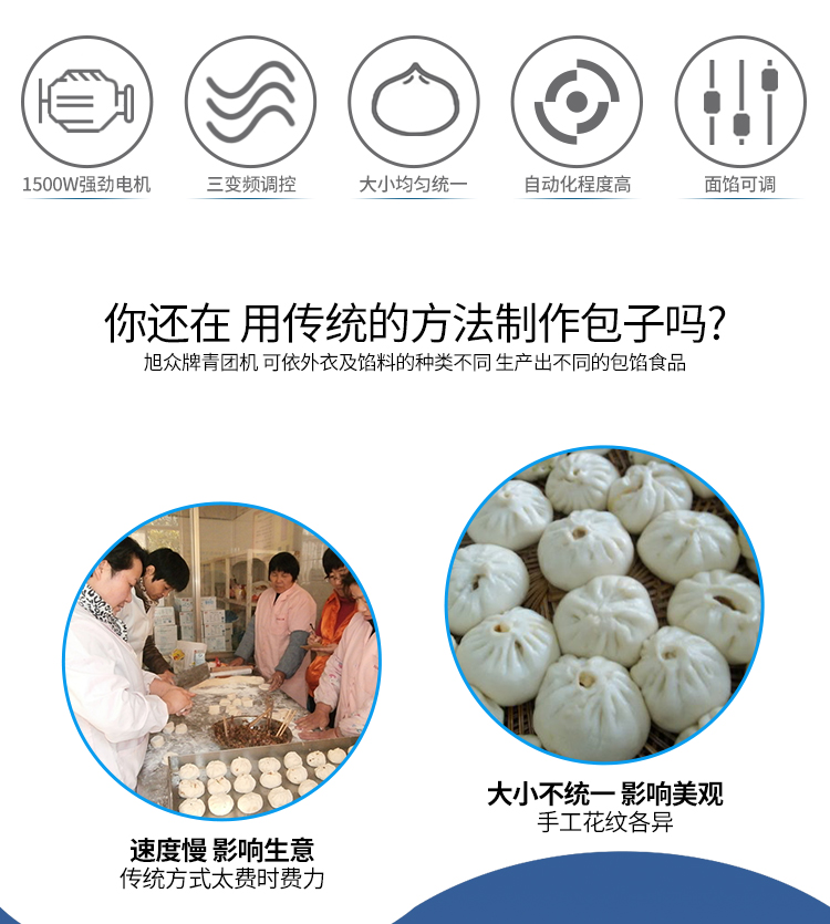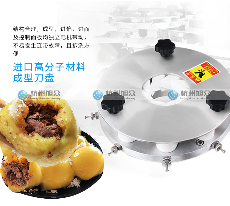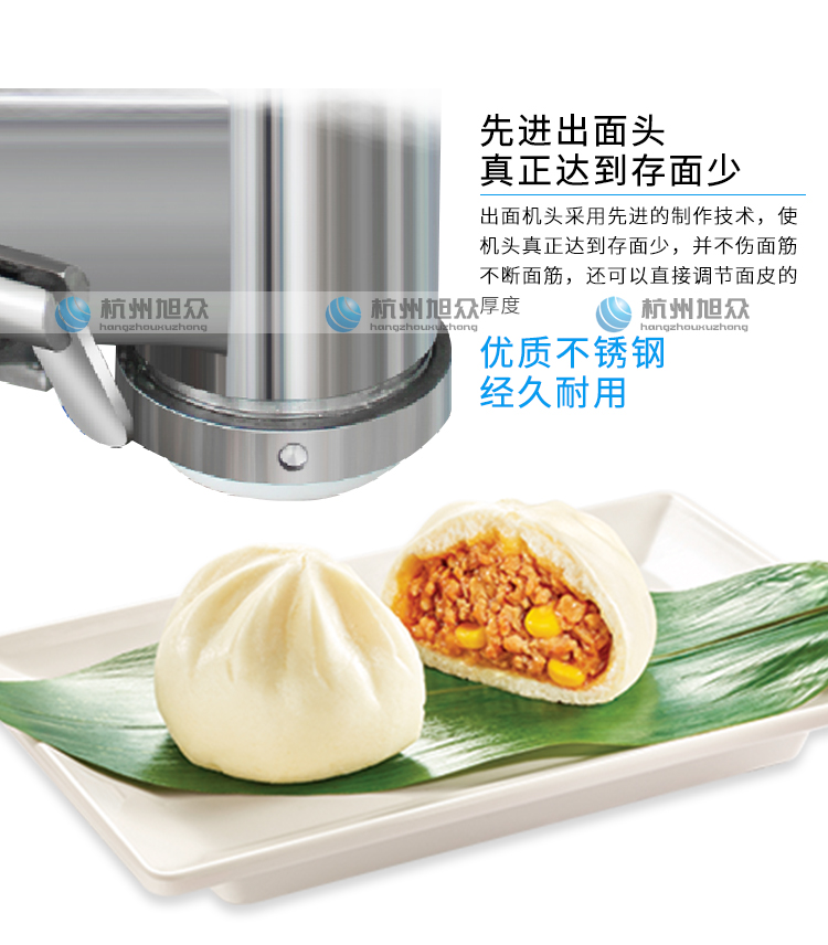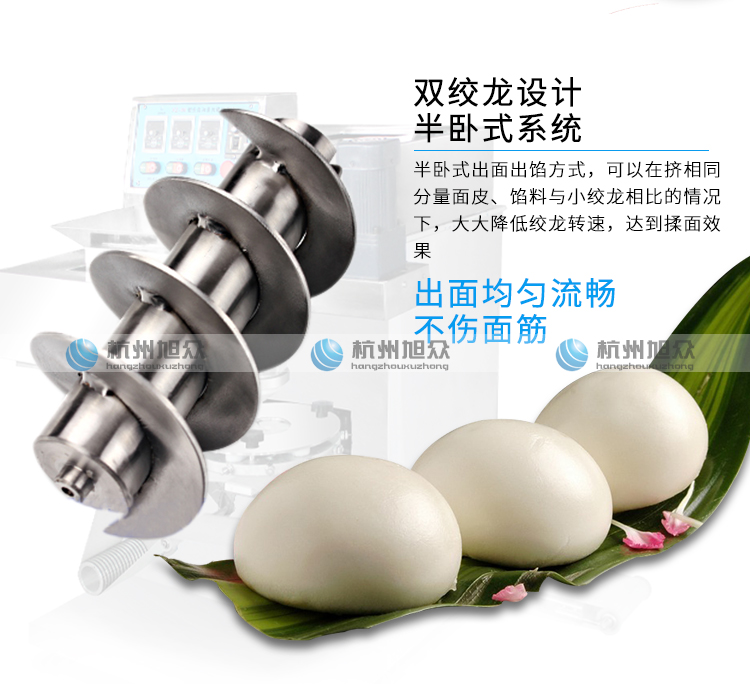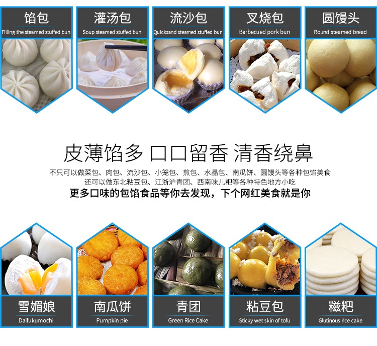 3.功能齊全,適用性廣,可依外皮及餡料的種類不同,可制作普通發(fā)面包子,小籠湯包,湯圓,芝麻球,豆沙包,南瓜餅,奶黃包,含餡饅頭,玉兔包等包餡食品;根據(jù)地域不同調(diào)配合適皮料,餡料還可以批量生產(chǎn)各種地方風(fēng)味小吃及各式點(diǎn)心。如:東北的粘豆包,江浙滬的青團(tuán),東南部的地瓜丸,香芋丸;西南的葉兒耙等等;