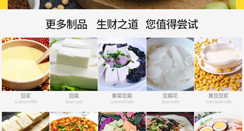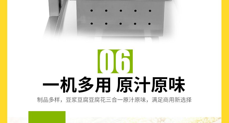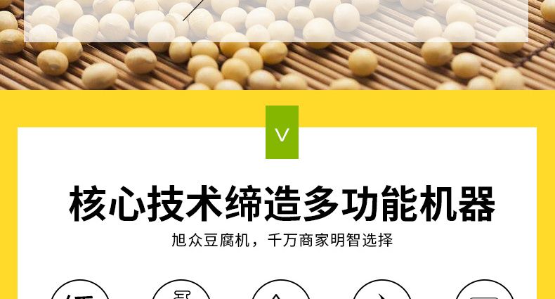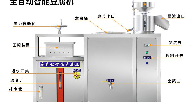 旭眾智能豆腐機專業生產數種豆漿制品,穩定高效,采用磨漿分離機和煮漿機,出品率高于其它設備,擁有自動控制系統,還增加數碼溫度控制儀,對煮漿隨時進行監控,同時對不同產品所需溫度自行設定,當煮漿達到設定溫度時,具有自動提示及報警功能;整機采用不銹鋼材質制作,質量卓越,占地面積小,安裝簡單,工藝先進,一臺設備只需一人操作,省時、省力、省工。