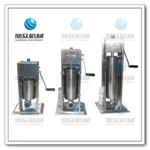 旭眾牌手搖灌腸機接觸食物的部位全部采用優質不鋼筋材料,衛生、安全;立式設計,外形美觀、大方。料筒折裝快速,清洗方便;全新的齒輪系統,使送料推力,快速、輕便地釋放提升推進活塞,工作效率高;此灌腸機是家用制作香腸或食堂、餐館、酒店專業制作香腸的理想產品。