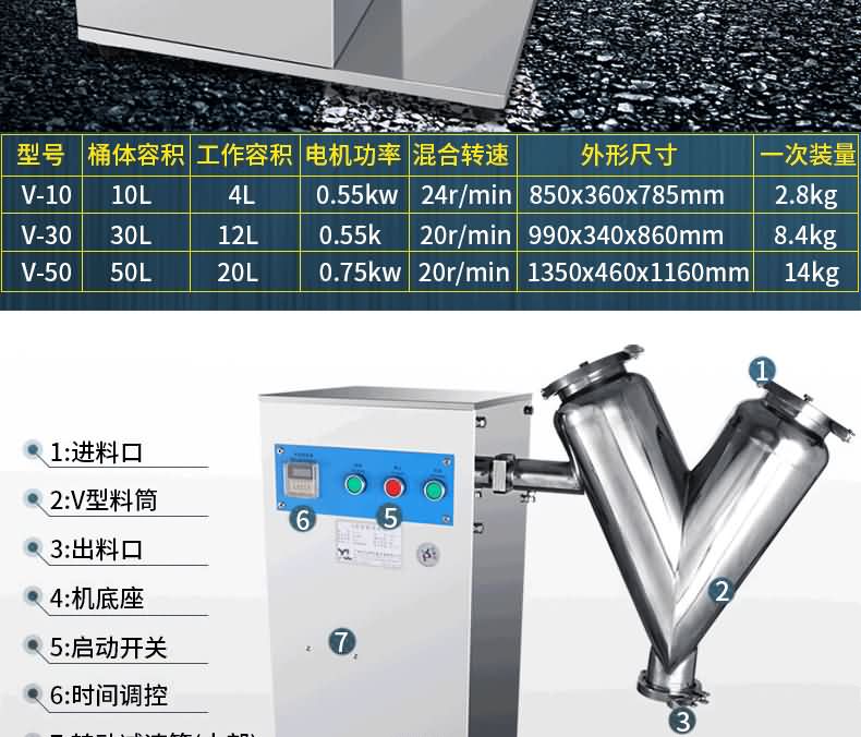 本設備采用手工進料和封閉碟形閥出料結構,可以實行無粉塵操作,同時物料在混合時沒有機械擠壓和強烈摩擦,可以保持物料顆粒完好無損,本機混合筒采用不銹鋼制造,對混合物料無任何污染。另外,本機還裝有定時裝置,可以控制物料的混合時間。