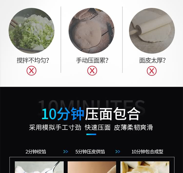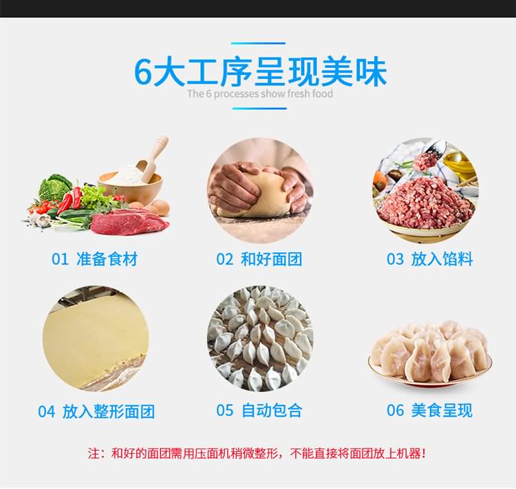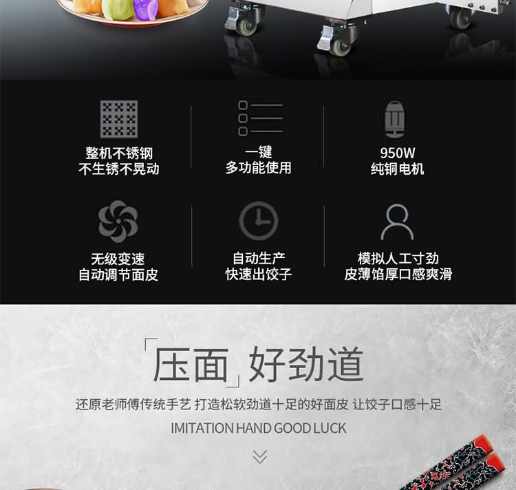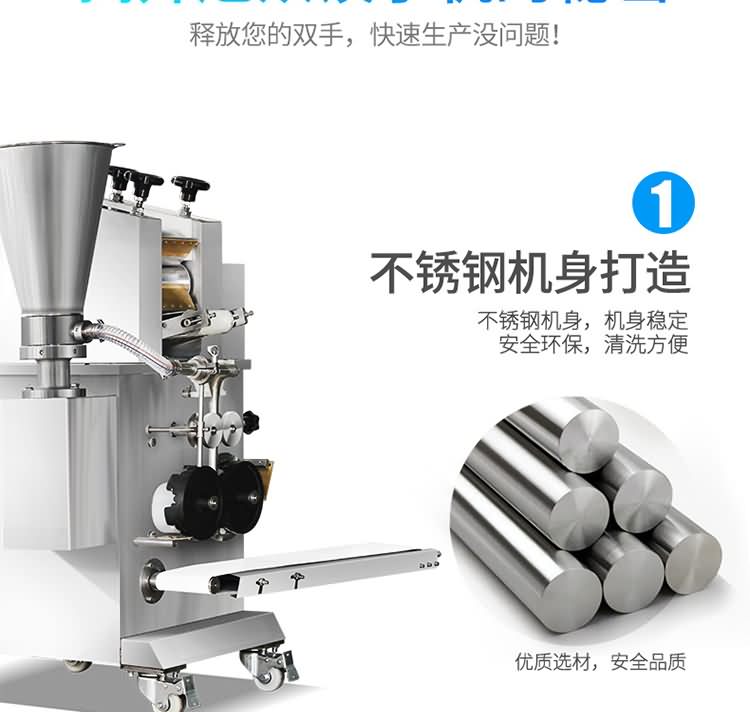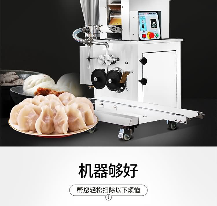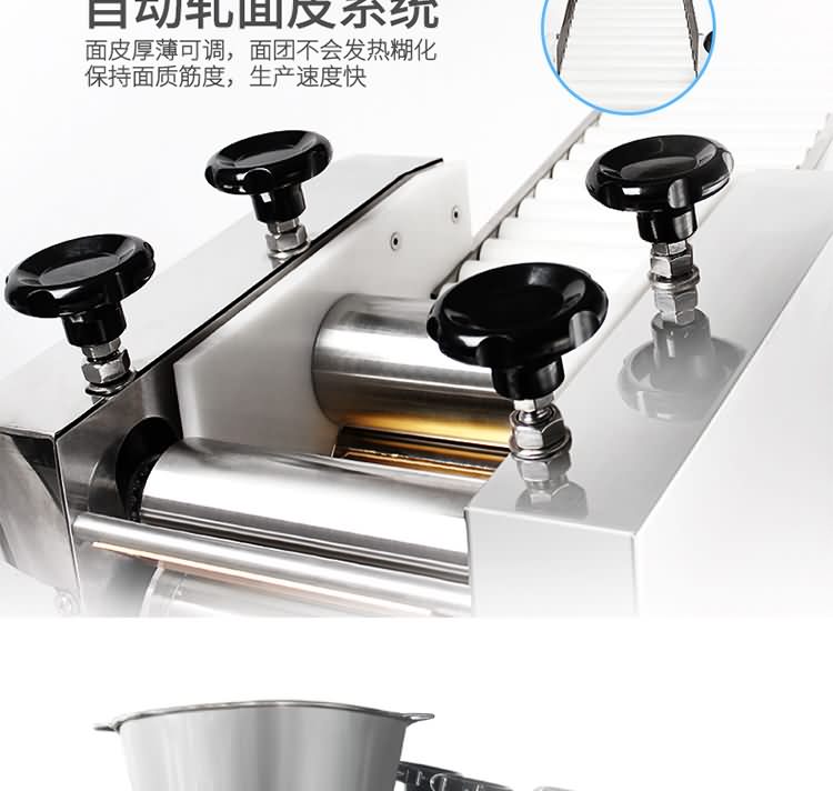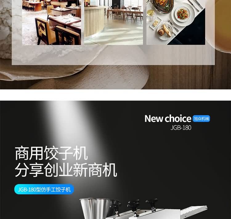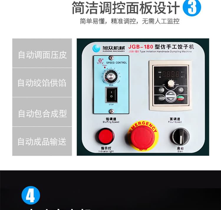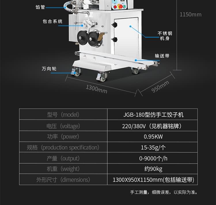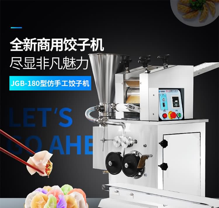JGB-180仿手工餃子機,先進的自動餃子生產設備,包括主動壓皮部分、自動供餡部分、自動包合部分、自動成品輸送部分,并且只要更換模具,就可制鍋貼等食品。適合食品速凍廠、飯店、廠礦學校食堂等制作包餡面制品單位使用。