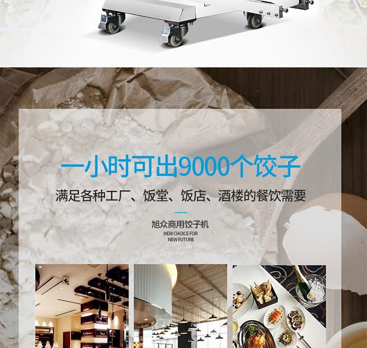 旭眾牌JGB-180型仿手工餃子機是我公司開發生產的先進的自動餃子生產設備。設備包括主動壓皮部分、自動供餡部分、自動包合成型部分、自動成品輸送部分,并且只要更換模具,就可制鍋貼等食品。本機采用自動軋制面皮后包制餃子的新工藝技術,采用多道壓面輥壓面,壓面效果優異,壓出的面皮筋道,進一步提高所包出的餃子口感。