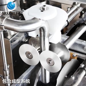 ?采用雙控雙向同步定量供料的方式,生產(chǎn)時只需將面團(tuán)與餡料放入指定入口,開機即可自動生產(chǎn)出餃子;