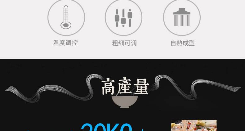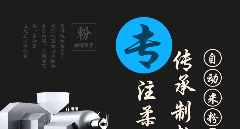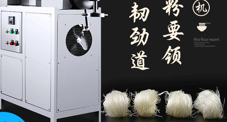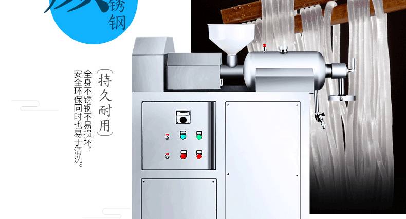 改進型不銹鋼米粉、米線專用機,裝有自動溫空裝置,整個生產過程設備均在恒溫狀態下運行,自動化程度高,操作簡單,l人即可生產。可生產米粉、米線、桂林米粉、過橋米線、年糕、糍粑等產品。各種形狀都可生產(圓、扁),加工食品外表光滑,厚薄、寬窄、粗細均勻可調,筋軟適度,有彈性,口感柔軟、味道純正。