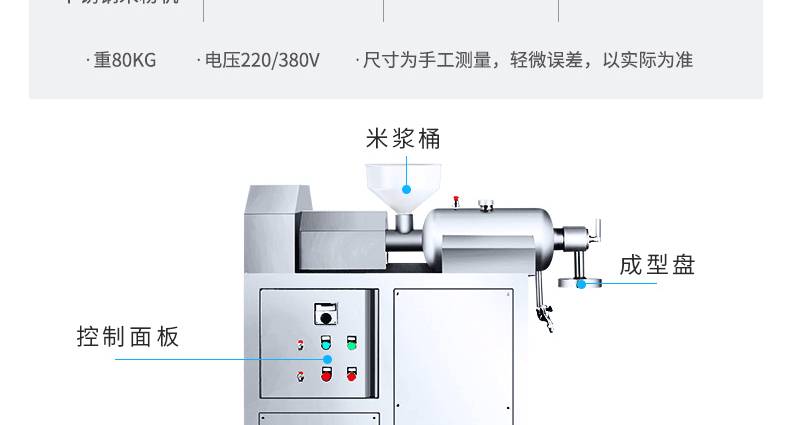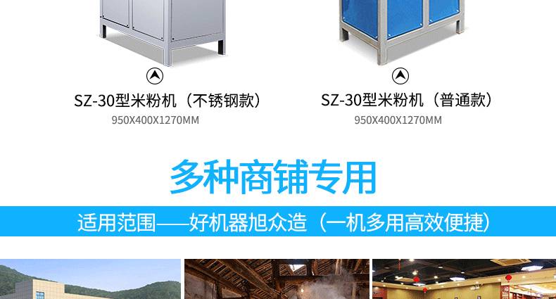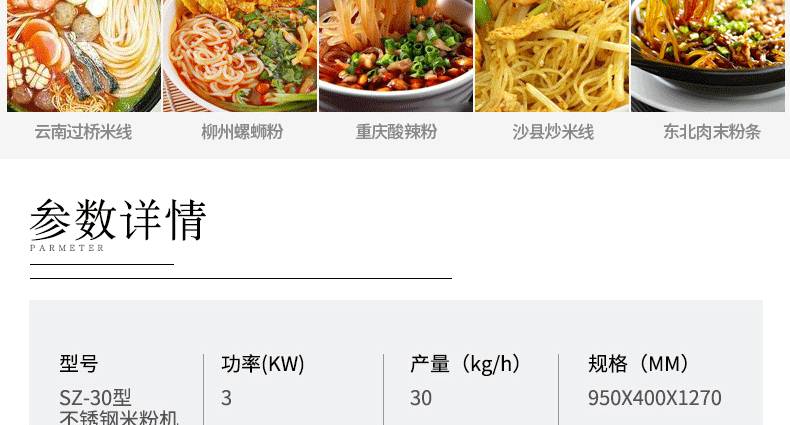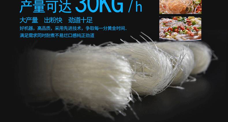 SZ-30不銹鋼米粉機,可生產米粉、米線、桂林米粉、過橋米線、年糕、糍粑等產品。各種形狀都可生產(圓、扁),加工食品外表光滑,厚薄、寬窄、粗細均勻可調,筋軟適度,有彈性,口感柔軟、味道純正。