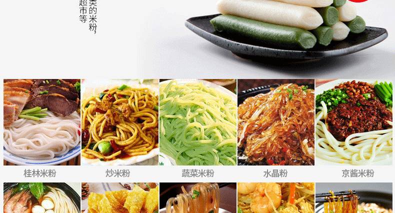 ◆ 不銹鋼米粉機生產多樣性可生產米粉、米線、粉絲、粉條、年糕、玉米面條、各種雜糧粉絲、各種面條、雜糧面條、彩色面條以及以紅薯、玉米、大豆、蠶豆等制成淀粉為原料的等多種食品而且每種食品厚薄、粗細等規格可根據需要任意調整。