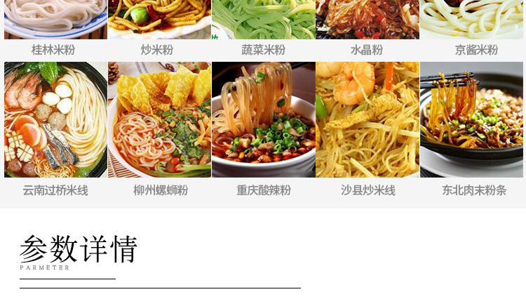 ◆ 米粉機生產多樣性可生產米粉、米線、粉絲、粉條、年糕、玉米面條、各種雜糧粉絲、各種面條、雜糧面條、彩色面條以及以紅薯、玉米、大豆、蠶豆等制成淀粉為原料的等多種食品而且每種食品厚薄、粗細等規格可根據需要任意調整。