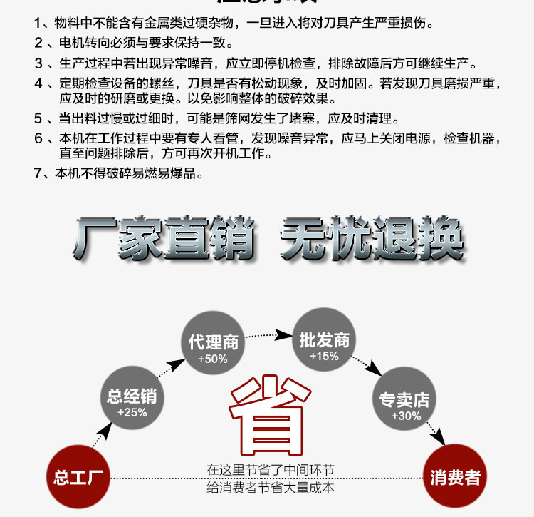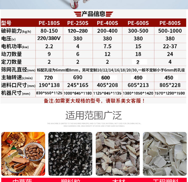 進(jìn)料口徑 | 190×138mm | 245×165mm | 405×208mm | 605×213mm | 805×228mm |