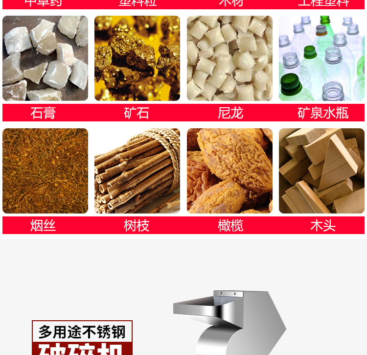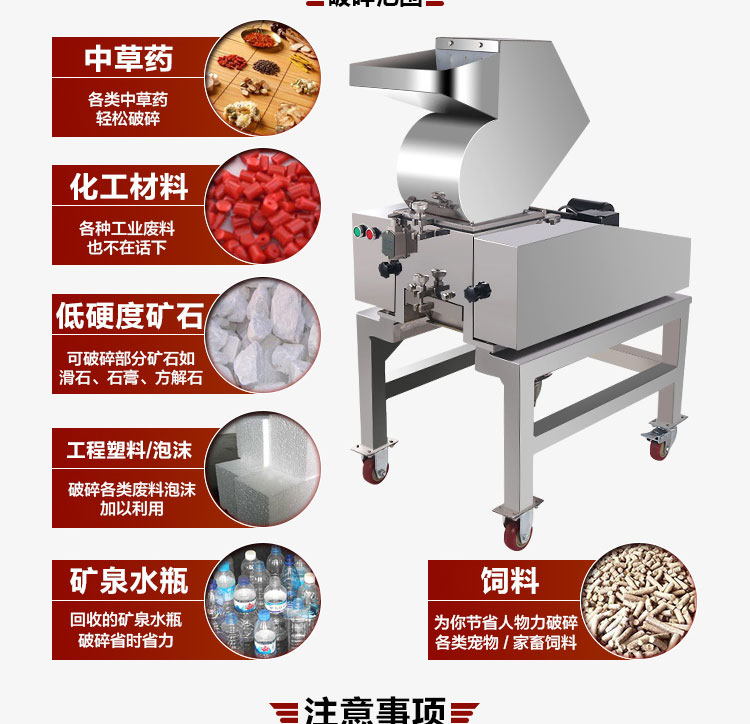不銹鋼破碎機(jī)適用于中草藥、化工材料、硬度較低的礦石以及聚苯乙烯、聚丙烯、尼龍、工程塑料和聚氯泡沫軟料的廢、次品或注射噴頭等破碎之用。如更換相應(yīng)的篩孔板,并調(diào)整刀片間隙,還可破碎各種吹塑膜、壓延膜、薄片、薄板、礦泉水瓶等塑料廢品。