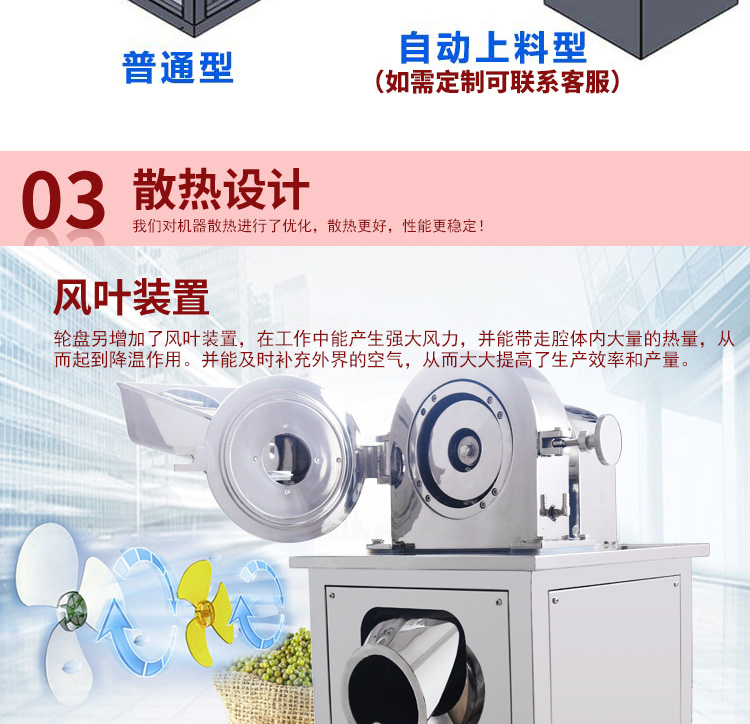 GN粉碎機(jī)利用渦輪盤(pán)帶動(dòng)活動(dòng)刀片對(duì)物料進(jìn)行撞擊、剪切,以及物料與物料、物料與齒圈的撞擊、摩擦進(jìn)行交替粉碎。輪盤(pán)另增加了風(fēng)葉裝置,在工作中能產(chǎn)生強(qiáng)大風(fēng)力,起到負(fù)壓上料功能,并能帶走腔體內(nèi)大量的熱量,并能及時(shí)補(bǔ)充外界的空氣,從而大大提高了生產(chǎn)效率和產(chǎn)量。