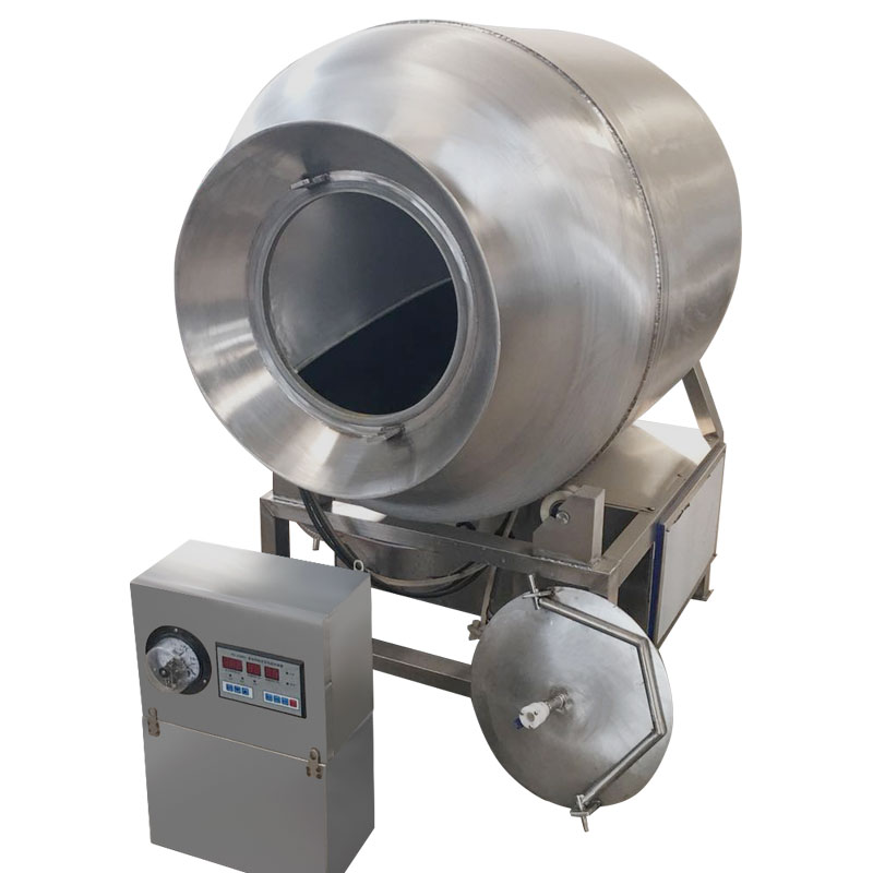 真空滾揉機是在真空狀態下,利用物理沖擊的原理,讓肉在滾筒內上下翻動,相互撞擊、摔打,達到按摩、腌漬作用,使肉均勻的吸收腌漬,提高肉的結著力及產品的彈性,通過滾揉、 按摩能使肉體蛋白質分解成水溶性蛋白,易被人體吸收,同時能使添加料(淀粉等)與肉體蛋白質互為融合以達到肉質變嫩,口感好,出口率高。真空滾揉機具有肺呼吸功能,讓產品在滾筒內膨脹,縮小了往復運動,改善了肉組織的結構,提高了切面效果。本機采用支架普通不銹鋼,滾筒(接觸食物部分)選用食品級304不銹鋼材質。