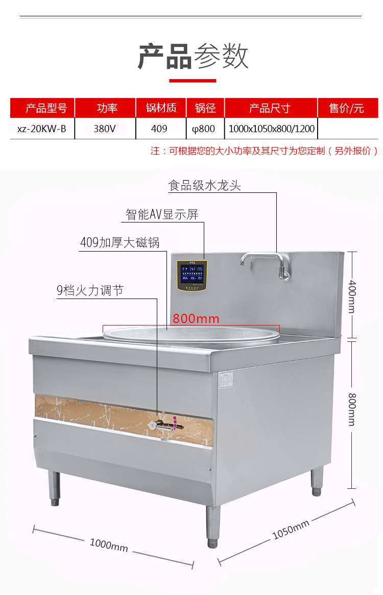 | 配置 | φ800大鍋409板材2.5mm厚,201不銹鋼外殼厚:側(cè)板1.0mm-20C面板1.5mm-20C |