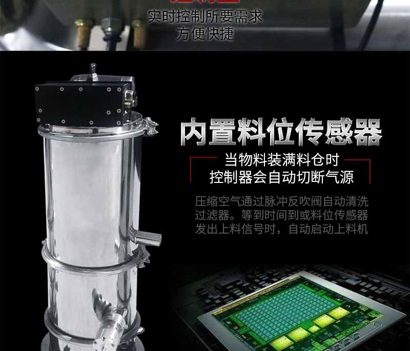 當(dāng)壓縮空氣供給真空發(fā)生器時,真空發(fā)生器就產(chǎn)生負(fù)壓形成真空氣流,物料被吸入吸料咀,形成物氣流,經(jīng)過吸料管到達上料機的料倉內(nèi)。過濾器把物料與空氣分離,當(dāng)物料裝滿料倉時,控制器會自動切斷氣源,真空發(fā)生器停止工作,同時料倉門自動開啟,物料落到設(shè)備的料斗中。與此同時,壓縮空氣通過脈沖反吹閥自動清洗過濾器。等到時間到或料位傳感器發(fā)出上料信號時,自動啟動上料機。