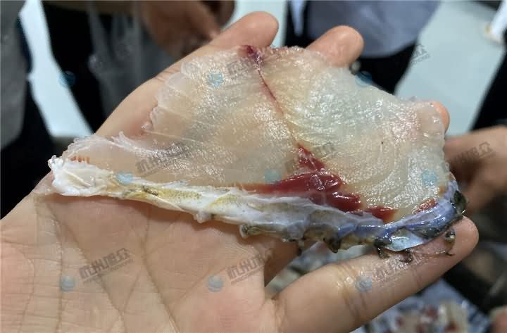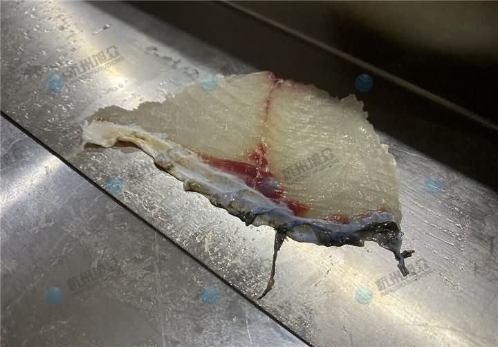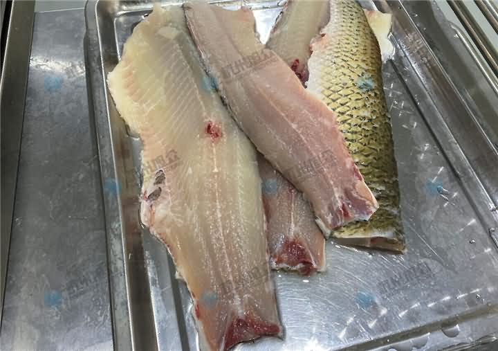 全自動切魚片機現場演示切草魚片,在切草魚片之前要做的工序,先去鱗開肚去內臟去魚頭后,再將魚大骨去掉,不去的話刀片容易損壞,所以要將魚大骨剃掉后再用魚片機30°斜度切成2.3mm魚片: