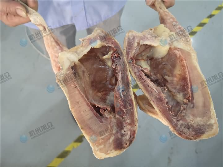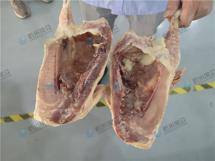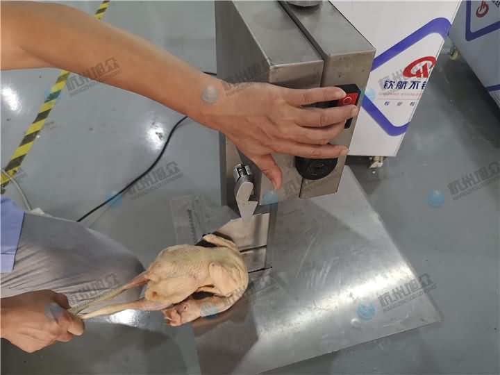 鋸骨機除了鋸排骨、豬蹄、筒骨類,還能鋸雞、鴨等禽類,鋸骨機鋸雞架效果: