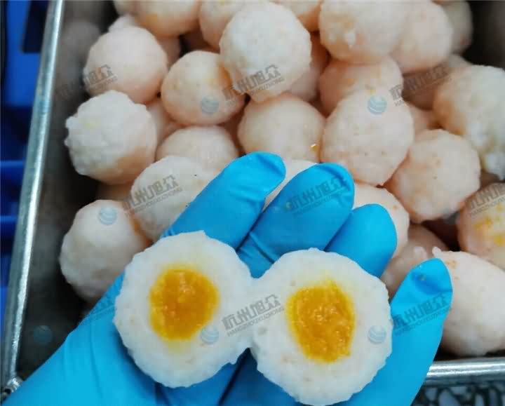 旭眾XZ-609包心肉丸機制作蝦滑包蛋黃效果: