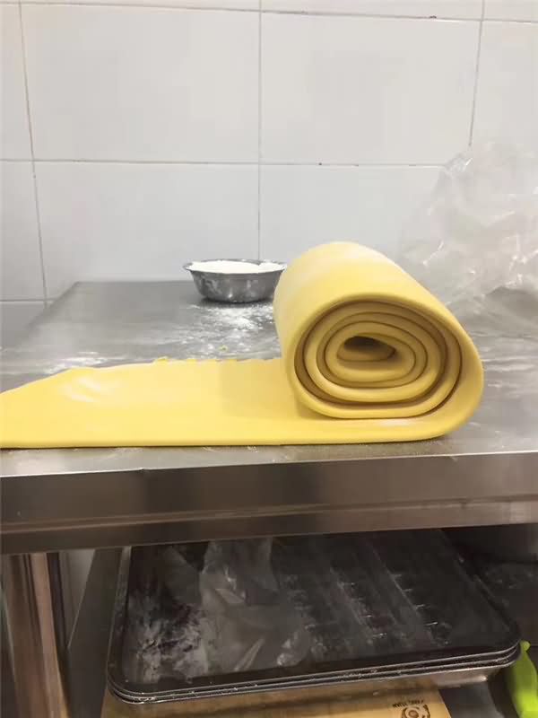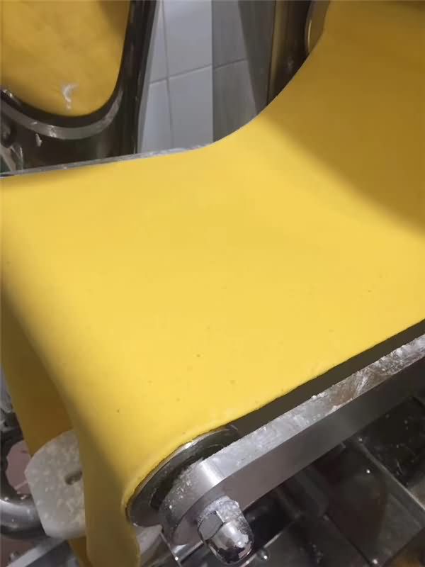 攪拌好面團后再用自動壓面機反復(fù)壓面皮,看著差不多就可以了