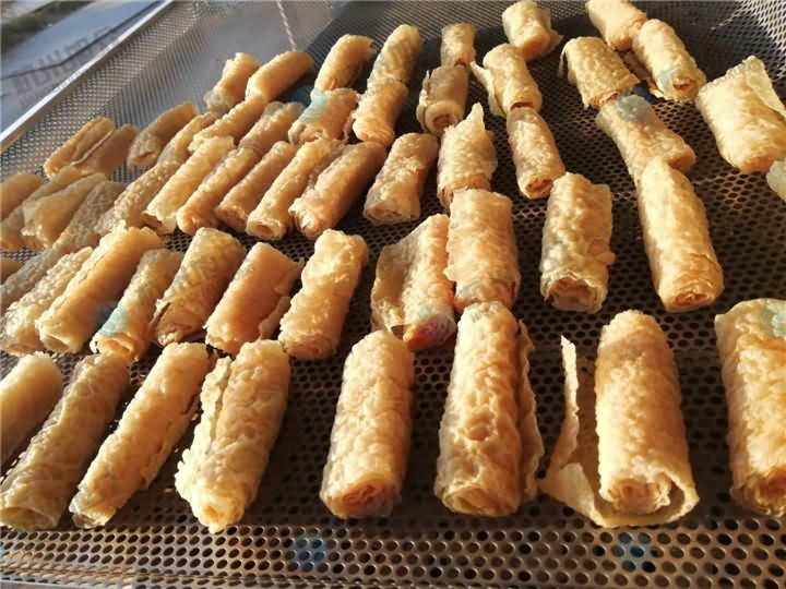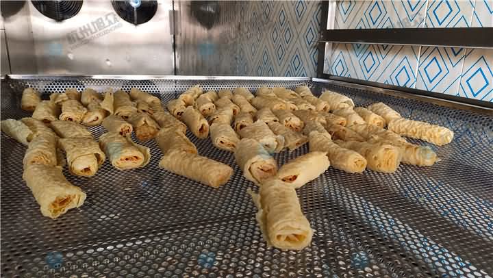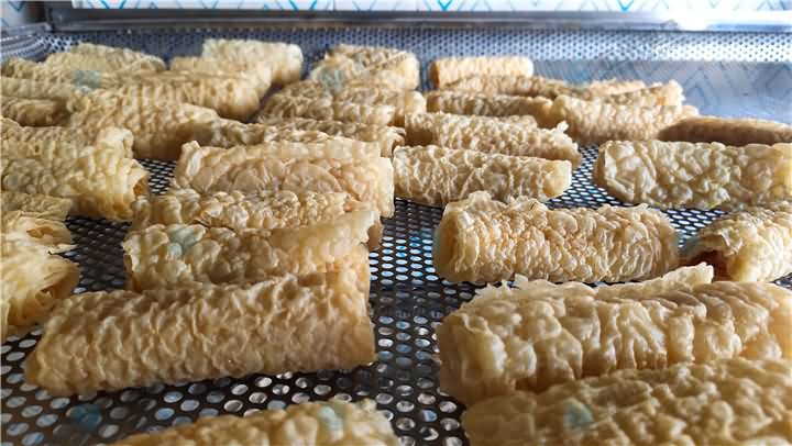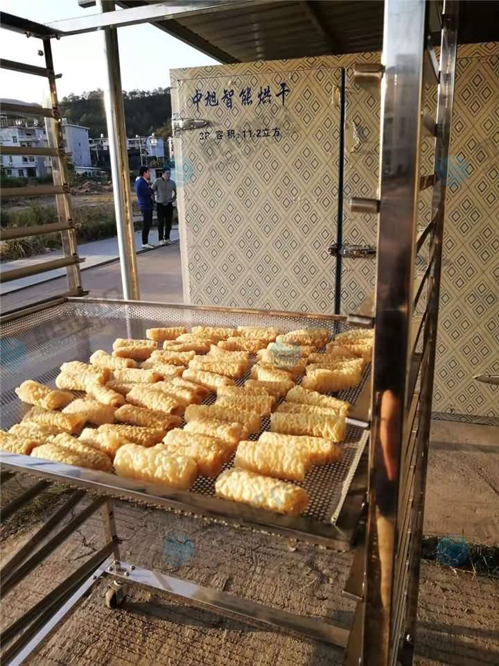 已經炸好的豆皮卷如何烘干才好呢?旭眾空氣能烘干機為您解決煩惱,只需將炸豆皮卷平鋪擺放蒸車中,再推入進烘干房內,設定好烘干時間,到時間烘干房自動停止運行,便可以看到烘干好的炸豆皮卷咯!