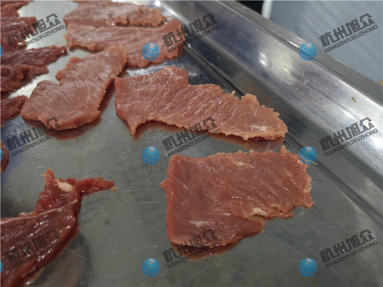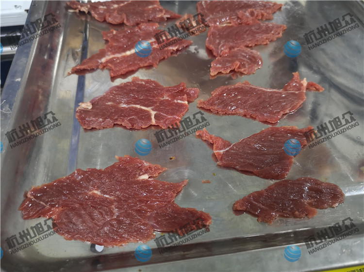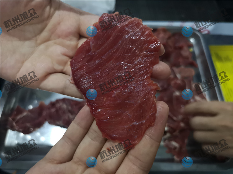 牛肉加工廠的福利,全自動斜切牛肉片/魚片機適用于肉類加工廠,魚類加工廠,大型餐飲行業等單位。全自動斜切魚片機切2.5mm鮮牛肉片效果如圖: