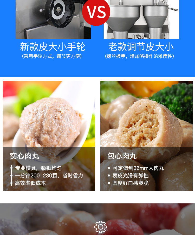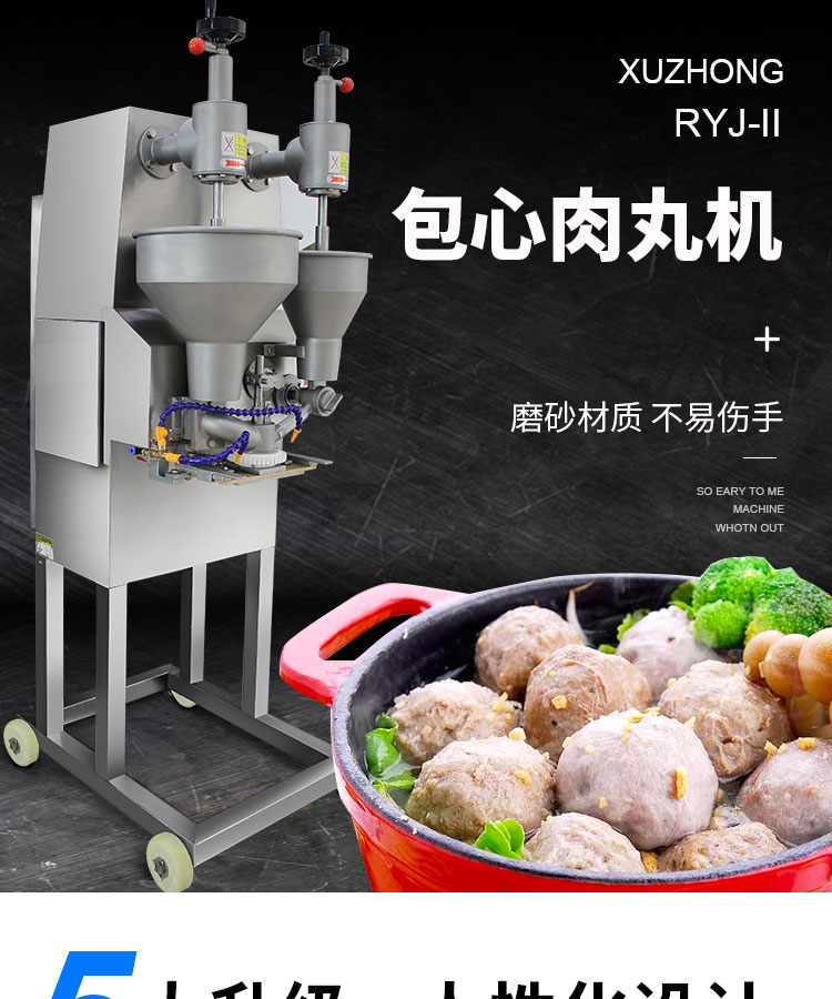 全自動肉丸機用機器代替手工,提高工作效率;XZ-609包心肉丸機每分鐘的生產能力為:200個~300個。大大提高工作效率,還能節省時間、空間、人工成本;提升廚房的品質衛生。