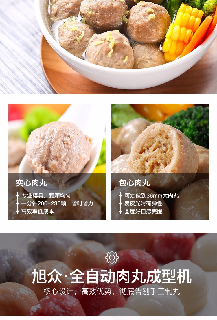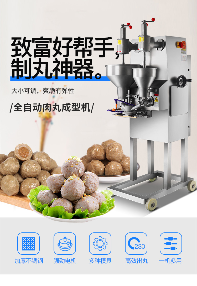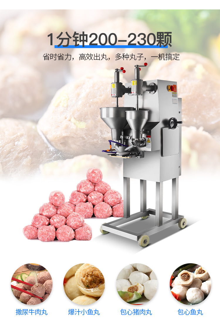 肉丸成型機為包餡肉制品成丸設備,能生產出各種大小尺寸的包餡魚丸、撒尿牛丸、豬肉丸、牛肉丸、及包餡貢丸等,并可做不包餡的各類丸子。該設備具有速度快、衛生方便、易拆洗等特點,可代替幾十個人手工生產,可為廠家節省人員的投入、提高生產速度。