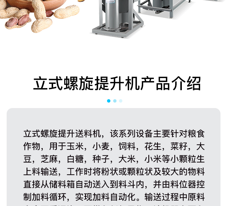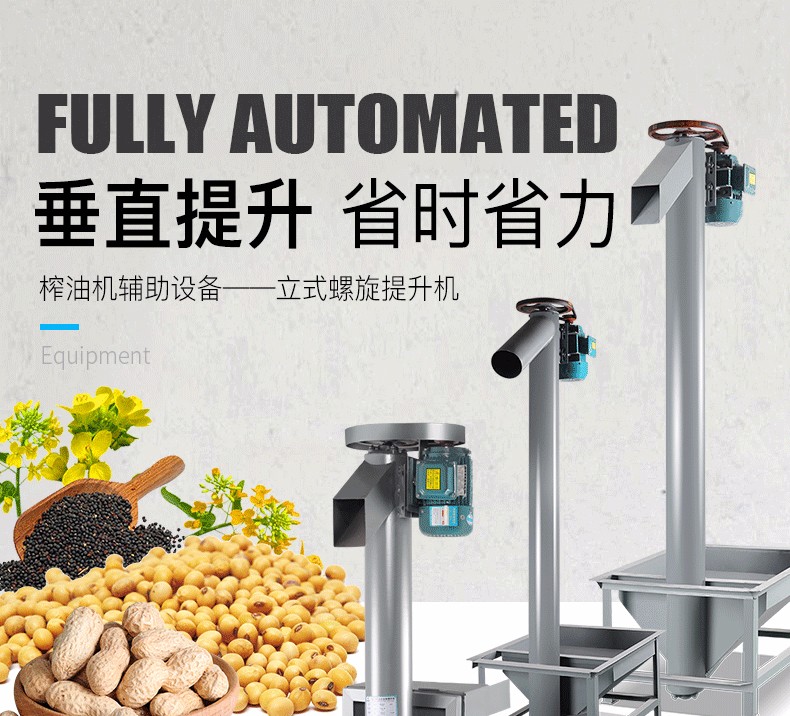 立式螺旋提升送料機(jī),該系列設(shè)備主要針對糧食作物,用于玉米,小麥,飼料,花生,菜籽,大豆,芝麻,白糖,種子,大米,小米等小顆粒生上料輸送,工作時將粉狀或顆粒狀及較大的物料直接從儲料箱自動送入到料斗內(nèi),并由料位器控制加料循環(huán),實(shí)現(xiàn)加料自動化。輸送過程中原料不受污染,不帶入任何異物。該機(jī)器主要和榨油機(jī)、飼料機(jī)配套使用,減少粉塵、減輕勞動強(qiáng)度,提升勞動效率。料口有圓形或方形可選。