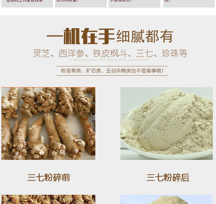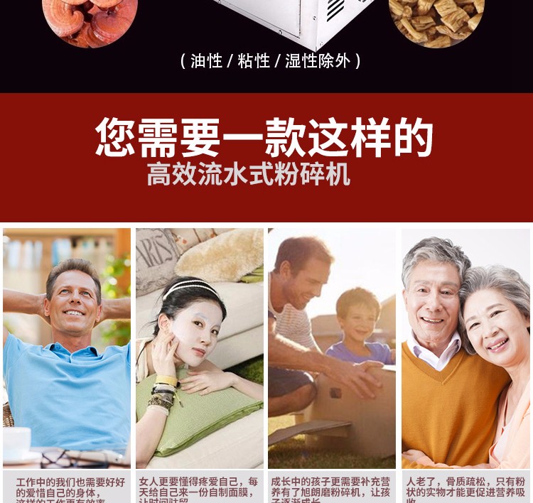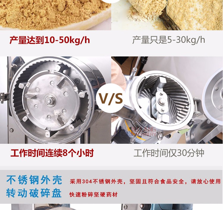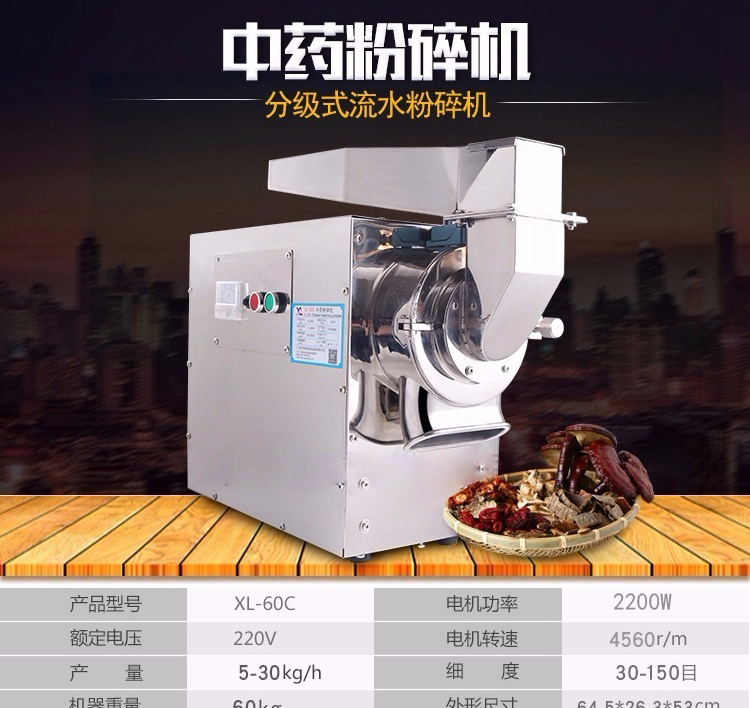 XL-60C中藥粉碎機能快速粉碎各種軟硬藥材和其他材質的物料,主要包括靈芝、西洋參、鐵皮楓斗、三七、珍珠、莖草類、礦石類、五谷雜糧、瑪卡、干燥的草本植物等(油性、濕性、粘性物料除外)。注:要直接投入的塊料尺寸不能大于40毫米。